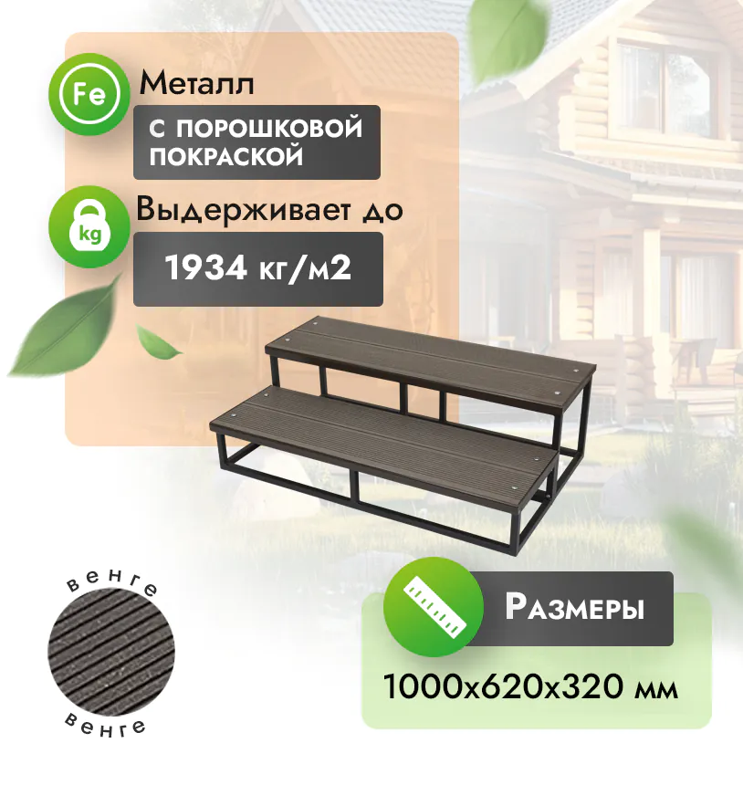 Наши ступени из ДПК выдерживают до 3318 кг/м2, влагостойкие, не требуют ухода.