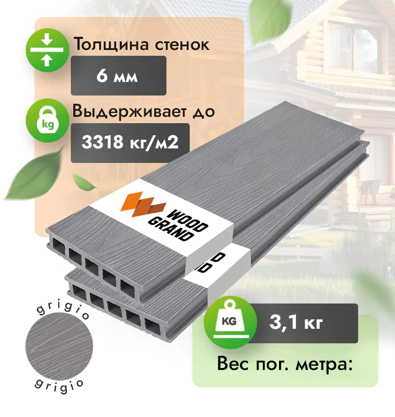Наша террасная доска из ДПК выдерживает до 3318 кг/м2, влагостойкая, не требует ухода.